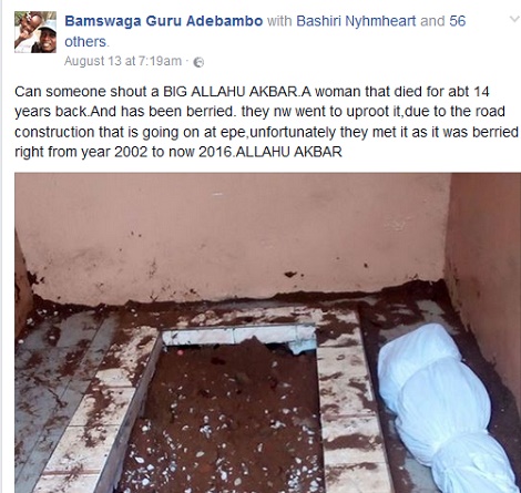 The man who broke the news wrote: "Can someone shout a BIG ALLAHU AKBAR. A woman that died for about 14 years back.And has been buried. they now went to uproot it, due to the road construction that is going on at Epe, unfortunately they met it as it was berried right from year 2002 to now 2016. ALLAHU AKBAR"